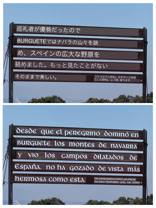 サンティアゴ巡礼13日目 Burgosまで18kmを歩きました。 Burgosを望む丘にスペイン語の看板があり日本語に翻訳してみた ブルゴス大聖堂とブルゴス城を見学 そこに先日の米加人と遭遇、親善を深める。言っておくがジジイ同士である。 pic.twitter.com/k4udOebkzJ