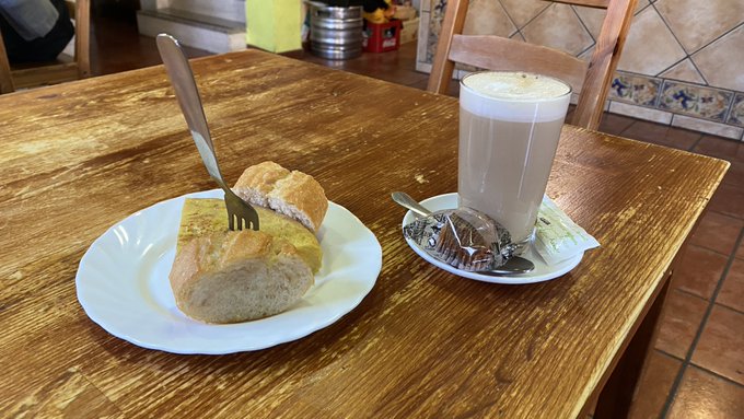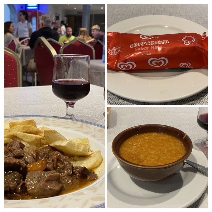 今日のメヌー14€ カスティーリャ風スープ ボークシチュー アイス ほぼ昨日と同じ 食事中に新潟からの夫婦と出会う 奥様足が動かなくなり当所に滞在中 明日レオンへバス移動したいが宿もないとのこと 同じホステルに宿泊した縁でスマホに宿予約アプリを設定して翌日のホステル予約をしてあげた pic.twitter.com/a7vRMhGUil