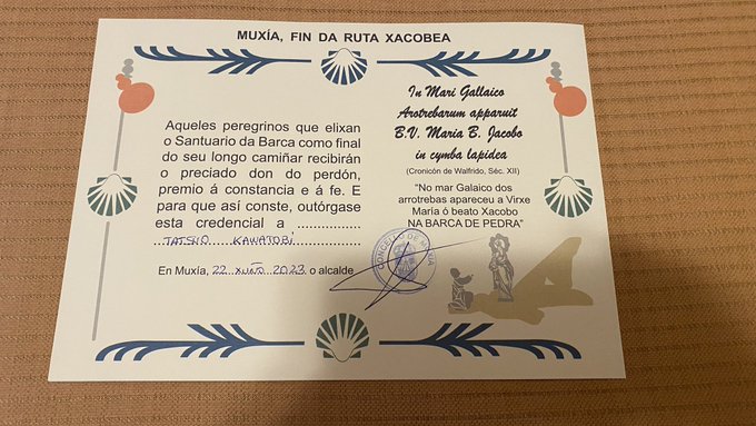 フィステーラ・ムシアの道の踏破証明書をいただきました pic.twitter.com/X9oPcXDCM4